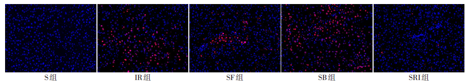 目的 探讨舒芬太尼预处理减轻大鼠肝缺血再灌注损伤(HIRI)的作用机制。方法 48只雄性SD大鼠按照随机数字表法分为:假手术组(S组)、HIRI组(IR组)、舒芬太尼预处理+HIRI组(SF组)、转化生长因子β1(TGF-β1)抑制剂+舒芬太尼预处理+HIRI组(SB组)、TGF-β1激动剂+舒芬太尼预处理+HIRI组(SRI组)和二甲基亚砜(DMSO)+HIRI组(DMSO组),每组8只,于造模完成后4 h取材。HE染色观察肝组织的形态变化;收集腹主动脉血测定各组丙氨酸转氨酶(ALT)、天冬氨酸转氨酶(AST)水平;制备10%肝组织匀浆,测定各组丙二醛(MDA)及超氧化物歧化酶(SOD)水平;TUNEL法检测肝细胞凋亡率;Western blot法检测肝组织TGF-β1及Smad2/3、p-Smad2/3、p38、p-p38蛋白表达水平。结果 与S组相比,其余各组损伤程度加重,ALT、AST、MDA水平及肝细胞凋亡率升高(P<0.05),SOD水平降低(P<0.05),IR组、SF组、SRI组中TGF-β1、p-Smad2/3、p-p38蛋白表达水平升高(P<0.05),SB组中TGF-β1、p-p38蛋白表达水平升高(P<0.05)。与IR组比较,SF组及SRI组损伤程度减轻,ALT、AST、MDA水平降低,肝细胞凋亡率降低,p-p38蛋白表达水平均降低(P<0.05),SOD水平升高,TGF-β1、p-Smad2/3蛋白表达水平均升高(P<0.05);SB组损伤程度加重,ALT、AST、MDA水平,肝细胞凋亡率,p-p38蛋白表达水平均升高(P<0.05),SOD水平和TGF-β1、p-Smad2/3蛋白表达水平均降低(P<0.05)。与SF组比较,SB组损伤程度加重,ALT、AST、MDA、肝细胞凋亡率及p-p38蛋白表达水均升高(P<0.05),SOD、TGF-β1、p-Smad2/3蛋白表达水平均降低(P<0.05);而SRI组损伤程度减轻,ALT、AST、肝细胞凋亡率、p-p38蛋白表达水均降低(P<0.05),SOD、TGF-β1、p-Smad2/3蛋白表达水平均升高(P<0.05)。结论 舒芬太尼预处理可能通过激活TGF-β/Smad信号通路和抑制p38 MAPK磷酸化,减轻肝细胞凋亡和氧化应激,从而发挥对大鼠HIRI的保护作用。