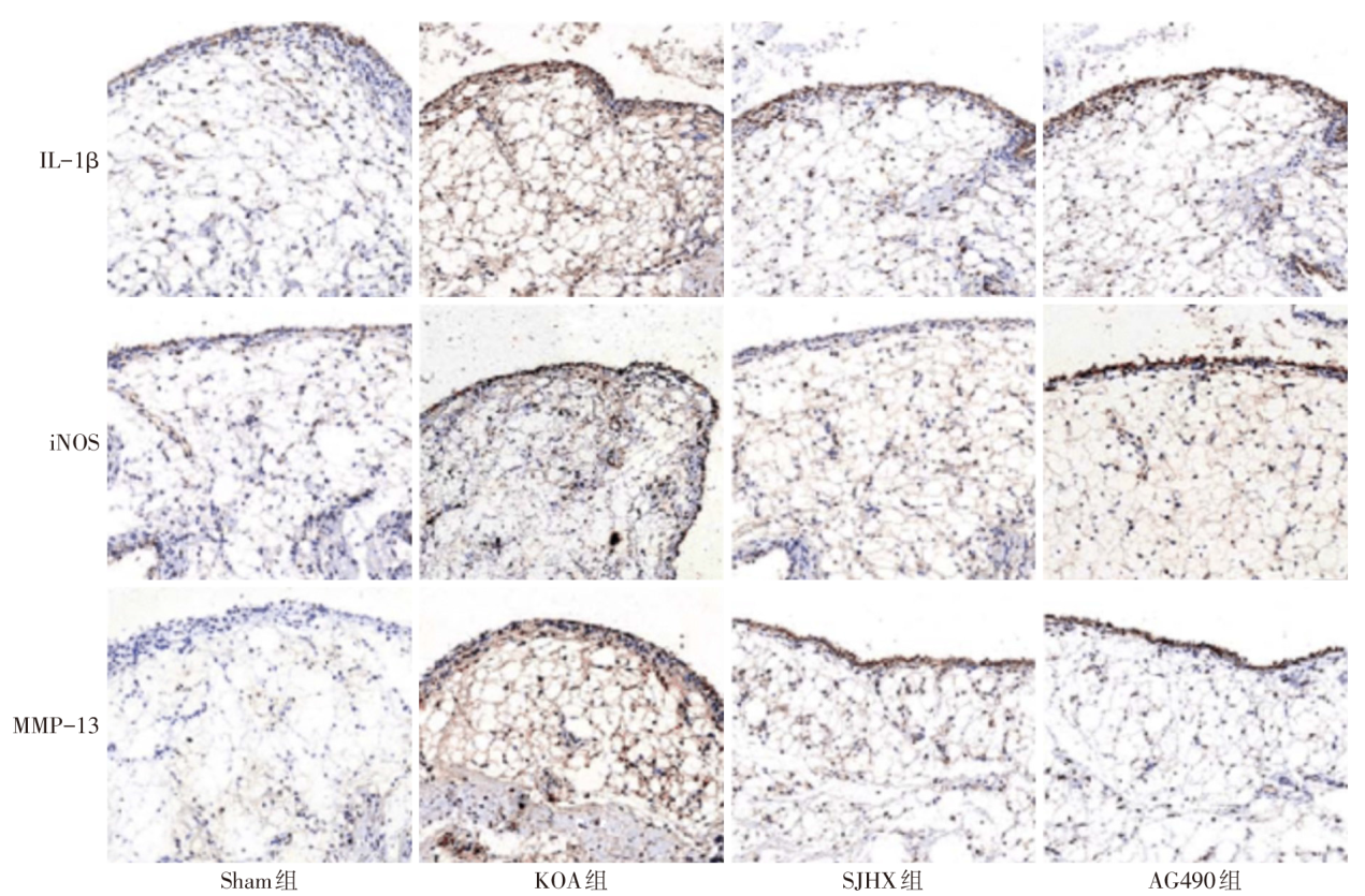 目的 探讨舒筋活血胶囊调控酪氨酸蛋白激酶2(JAK2)/信号转导及转录激活蛋白3(STAT3)信号通路对大鼠膝骨关节炎(KOA)的影响及其机制。方法 采用Hulth法制备大鼠KOA模型,将60只大鼠分为假手术组(Sham组)、KOA组、舒筋活血胶囊组(SJHX组)(472.5 mg/kg 舒筋活血胶囊灌胃)、AG490组(5.0 mg/kg的JAK2抑制剂AG490腹腔注射),每组15只。HE染色与番红O-固绿染色观察滑膜组织与软骨组织病理变化,酶联免疫吸附试验(ELISA)检测血清白细胞介素(IL)-10、IL-1β、肿瘤坏死因子α(TNF-α)水平,免疫荧光法检测M1/M2型巨噬细胞极化,免疫组化染色检测IL-1β、诱导型一氧化氮合成酶(iNOS)、基质金属蛋白酶(MMP)-13蛋白表达,Western blot检测JAK2/STAT3通路相关蛋白。结果 与Sham组比较,KOA组大鼠关节面不平整,滑膜组织与软骨组织结构破坏,病理评分增加,血清IL-1β、TNF-α水平明显升高,IL-10水平降低,滑膜组织IL-1β、iNOS、MMP-13、p-JAK2/JAK2、p-STAT3/STAT3表达水平及M1、M2型巨噬细胞、M1/M2比值升高(P<0.05);与KOA组比较,SJHX组与AG490组大鼠滑膜组织与软骨组织病理损伤减轻,病理评分降低,血清IL-1β、TNF-α水平降低,IL-10水平升高,滑膜组织IL-1β、iNOS、MMP-13、p-JAK2/JAK2、p-STAT3/STAT3表达水平及M1巨噬细胞、M1/M2比值降低(P<0.05)。结论 舒筋活血胶囊可通过抑制JAK2/STAT3信号通路激活,调节M1/M2巨噬细胞极化,改善KOA大鼠滑膜炎症状。