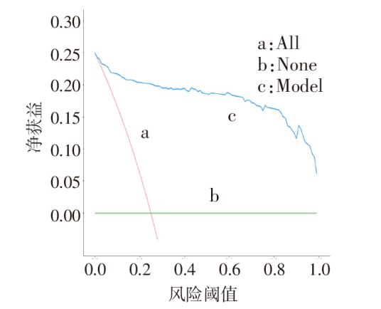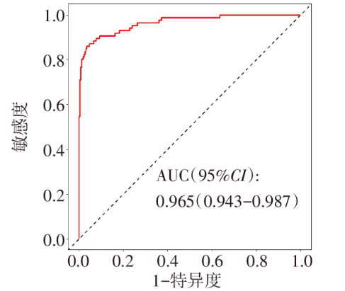 目的 基于Lasso-Logistic回归构建类风湿关节炎(RA)患者动脉粥样硬化(AS)风险预测模型,为个体化临床干预提供科学依据。方法 回顾性收集344例RA患者的临床数据,其中单纯RA组258例和RA+AS组86例。比较2组临床特征和入院首次实验室检查指标的差异。采用Lasso回归筛选关键预测变量,并结合Logistic回归构建预测模型。通过受试者工作特征(ROC)曲线和曲线下面积(AUC)评价模型的区分度,Hosmer-Lemeshow检验评估校准度,并使用决策曲线分析验证模型的临床适用性。结果 筛选出RA病程、28项关节疾病活动度(DAS28)评分、C反应蛋白(CRP)、三酰甘油(TG)、高密度脂蛋白胆固醇(HDL-C)、空腹血糖(FBG)水平和高血压7个预测变量。RA患者AS风险预测模型为Logit(P)=-2.674+0.605×RA病程+0.393×DAS28评分+0.310×CRP+1.346×TG-2.289×HDL-C+0.679×FBG+0.711×高血压。构建的模型AUC为0.965(95%CI:0.943~0.987),Hosmer-Lemeshow χ2=0.547,P=1.000,显示模型区分度和校准度较好。临床决策曲线分析显示概率阈值在7%~92%范围内时,模型具有较高的临床实用性。结论 基于Lasso-Logistic回归构建的RA患者AS风险预测模型可有效识别高风险患者,为制定个体化的预防和治疗策略提供支持。