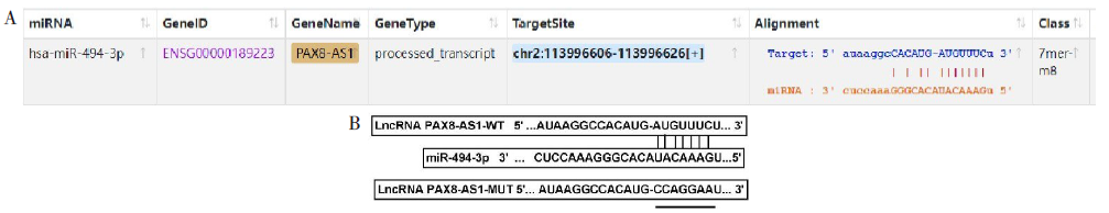 图4 starbase对lncRNA PAX8-AS1和miR-494-3p结合进行预测示意图 A:网站预测图;B:野生序列与突变序列对比图。