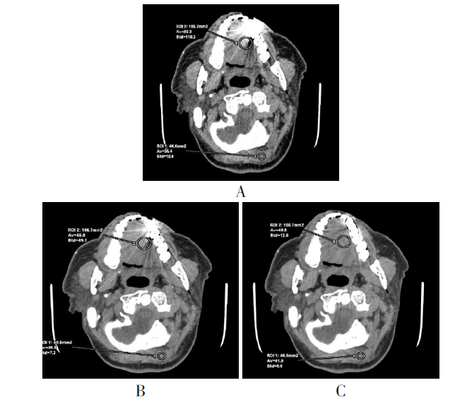 图5 烤瓷义齿植入在3种不同参数条件下的对比效果 A:QC图像,义齿周围大量条片状明暗相间高密度硬化伪影及低密度暗区;B:单能谱110 keV影像,义齿周围金属伪影较QC减少;C:110 keV+MARs影像;主观评分分别为2.5分、3.0分、4.5分。