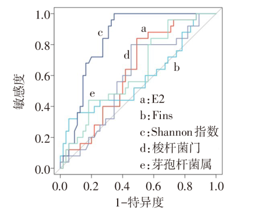 目的 探究反复种植失败(RIF)患者子宫内膜微生物组特征与后续移植结局的相关性。方法 回顾性选取再次接受胚胎移植的438例RIF患者,根据胚胎移植后8周的妊娠情况将患者分为妊娠组(n=85)与未妊娠组(n=353),比较2组临床资料与子宫内膜微生物组特征以及组成情况;二分类Logistic回归分析影响因素并采用受试者工作特征(ROC)曲线预测影响因素效能;进一步分析上述危险因素与Shannon指数在RIF患者后续移植结局中的交互作用。结果 未妊娠组患者基础雌二醇(E2)、空腹胰岛素(Fins)、总胆固醇(TC)、三酰甘油(TG)水平高于妊娠组(均P<0.05);2组梭杆菌门丰度、芽孢杆菌属丰度及Alpha多样性(Chao1、Shannon、Simpson)指数差异均有统计学意义(均P<0.05);二分类Logistic回归分析显示,梭杆菌门丰度升高(OR=1.628,95%CI:1.416~1.841)、芽孢杆菌属丰度降低(OR=0.725,95%CI:0.557~0.934)、E2升高(OR=1.654,95%CI:1.343~1.965)、Fins升高(OR=1.691,95%CI:1.393~1.980)和Shannon指数降低(OR=0.388,95%CI:0.075~0.697)是后续移植失败的独立危险因素。ROC曲线分析显示,Shannon指数的曲线下面积为0.836(95%CI:0.782~0.890),预测效能最高;亚组梭杆菌门、芽孢杆菌属、E2、Fins在Shannon指数对RIF患者后续移植结局中存在显著交互作用。结论 RIF患者后续移植失败的独立危险因素可作为预测RIF患者后续移植结局的敏感指标,且Shannon指数临床预测价值更高。