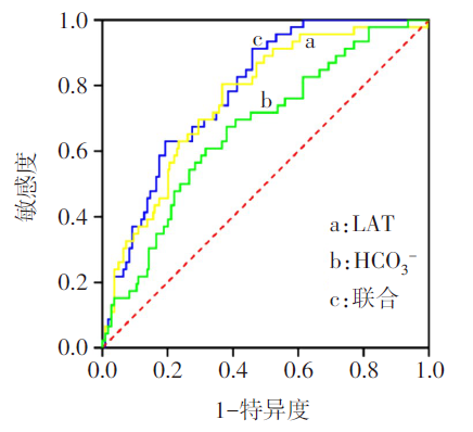 | LAT和HCO3-联合 | 0.784 | 0.712~0.856 | -2.176 | 0.037 | <0.001 | 0.913 | 0.541 |