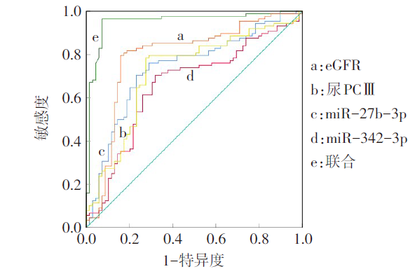 Objective To investigate the serum expression characteristics of miR-27b-3p and miR-342-3p in type 2 diabetic nephropathy (DN) patients and the diagnostic value for DN. Methods A total of 157 patients with DN were selected and divided into the normal albuminuria group (NA group, n=49), the microalbuminuria group (MA group, n=41) and the macroalbuminuria group (DN group, n=67) according to the ratio of albumin to creatinine (UACR) of urine specimens. Clinical data and the expression of serum miR-27b-3p and miR-342-3p, renal function and urinary fibrosis indicators were detected by real-time quantitative polymerase chain reaction. Blood urea nitrogen (BUN) and blood creatinine (Scr), were detected by automatic biochemical analyzer. Urine type Ⅳ collagen (Ⅳ-C), laminin (LN) and type Ⅲprocollagen peptide (PCⅢ) were detected by double-antibody sandwich enzyme-linked immunosorbent assay. The factors influencing the pathogenesis of DN and the diagnostic value of miR-27b-3p and miR-342-3p for DN were analyzed. Results Compared with the NA group, the levels of HbA1c, UACR, urinary Ⅳ-C, urinary LN and urinary PCⅢ were increased, while the expresson levels of miR-27b-3p and miR-342-3p were decreased in the DN group and the MA group (P<0.05). Levels of BUN and Scr were increased in the DN group (P<0.05), and eGFR level decreased (P<0.05). The higher level of urinary PCⅢ was a risk factor for DN, while the higher levels of miR-27b-3p, miR-342-3p and eGFR were protective factors of DN (P<0.05). The expressions levels of miR-27b-3p and miR-342-3p were positively correlated with eGFR (r = 0.647, 0.661, P<0.05) and negatively correlated with urinary PCⅢ (r=-0.739, P<0.05). The area under the curve for diagnosing DN by combining eGFR, urinary PCⅢ, miR-27b-3p and miR-342-3p was higher than that of eGFR, urinary PCⅢ, miR-27b-3p, miR-342-3p alone (Z=5.631, 5.794, 6.715, 4.577, P<0.05). Conclusion The decreased expressions of serum miR-27b-3p and miR-342-3p are associated with decreased renal function and DN occurrence in patients with type 2 diabetes, which can be used as biological indicators for the auxiliary diagnosis of DN.