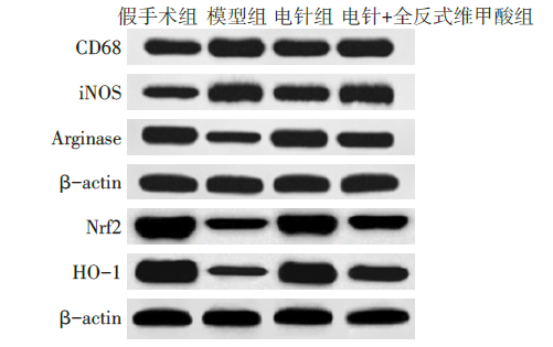 | 电针+全反式维甲酸组 | 0.038±0.005abc | 0.030±0.004abc | 227.15±16.50abc | 5.80±0.30abc |