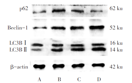 | 组别 | n | p62/ β-actin | Beclin-1/ β-actin | LC3BⅡ/Ⅰ | LC3BⅡ/ β-actin |