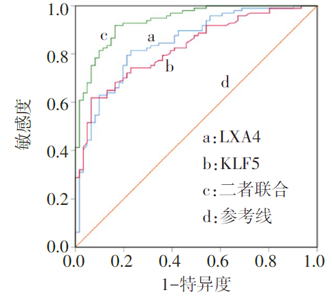 Objective To discuss the expression and clinical significance of serum lipoxin A4 (LXA4) and Kruppel-like factor 5 (KLF5) in children with Mycoplasma Pneumoniae pneumonia (MPP). Methods A total of 158 children with MPP were enrolled (MPP group) and further classified into the severe group (n=97) and the mild group (n=61) according to disease severity. Based on the 28-day clinical outcome, patients were also categorized into the good prognosis group (n=105) and the poor prognosis group (n=53). In addition, 91 healthy children were included as the control group. Serum levels of LXA4 and KLF5 were measured using enzyme-linked immunosorbent assay (ELISA). Multivariate Logistic regression analysis was used to identify factors influencing prognosis, and receiver operating characteristic (ROC) curve analysis was performed to evaluate the diagnostic value of serum LXA4 and KLF5 levels for disease and predictive value for prognosis. Results Compared with the control group, the serum level of LXA4 was decreased and the level of KLF5 was increased in the MPP group (P<0.05). Compared with the mild group, the serum level of LXA4 was decreased, and the level of KLF5 was increased in the severe group (P<0.05). The area under the ROC curve (AUC) for the combined diagnosis of disease severity in children using serum LXA4 and KLF5 was 0.936 (95%CI:0.886-0.969), indicating that the combined diagnostic performance was superior to that of LXA4 or KLF5 alone (Z joint - LXA4=2.728, Z joint - KLF5=4.208, P<0.05). The proportion of severe cases, levels of procalcitonin (PCT), C-reactive protein, length of hospital stay and serum KLF5 level were significantly higher in the poor prognosis group than those in the good prognosis group, while serum LXA4 level was significantly lower in the poor prognosis group (P<0.05). Severe disease, elevated levels of PCT and KLF5 were identified as risk factors for poor prognosis in children with MPP, whereas elevated LXA4 levels were protective factors (P<0.05). The area under the ROC curve (AUC) for the combined prediction of prognosis using serum LXA4 and KLF5 was 0.935 (95%CI: 0.885-0.968), which was significantly higher than that of LXA4 or KLF5 alone (Z joint - LXA4=4.270, Z joint - KLF5=3.136, P<0.05). Conclusion Serum LXA4 is decreased and KLF5 is increased in children with MPP. The combination of the two has high clinical application value in diagnosing disease condition and predicting the prognosis of children with MPP.